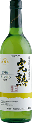 完熟デラウェアの爽やか&凝縮した甘味をボトルに詰め込んだ、極甘口デザートワイン「この甘さがクセになる」と、毎年、心待ちにしているファンも多い、極甘口の白。完熟デラウェアをそのまま頬張っているかのような、凝縮した甘味とフルーティで爽やかな味わいが魅力です。また、熟成させても美味しく、秋を越え冬に近づくとワインの色調が徐々に黄金色に変わり、より濃厚な蜂蜜の様な味わいを楽しめます。熟成感を楽しむ際は、クリスマスやお正月を越えた頃まで待つのがおススメです。 [タイプ]極甘口 参考本体価格(10%税込) アルプス『完熟』(株)アルプス【長野・塩尻】 信州産完熟ブドウの溢れんばかりのフレッシュ&フルーティさ